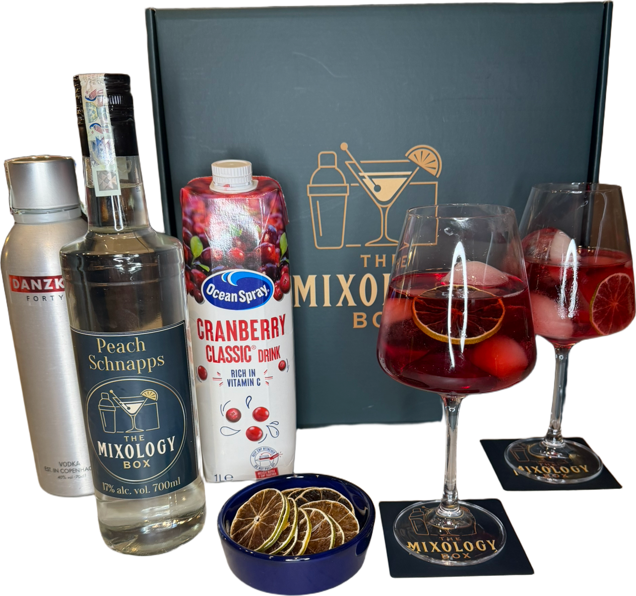 Mixology Box е сезонна коктейлна кутия с 3 бутилки в пълен размер, гарниш, рецепта + видео и поставки за чаши.